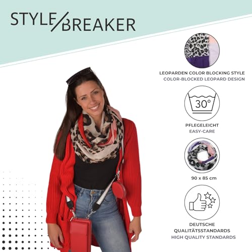 Der styleBREAKER Damen Loop Schal mit Leoparden Animal Print Muster und Color Blocking Farbflächen ist ein modisches Accessoire, das deinem Outfit einen besonderen Akzent verleiht. Mit seinem auffälligen Design kombiniert er Funktionalität und Stil, sodass er sowohl in der Freizeit als auch im Alltag einsetzbar ist.