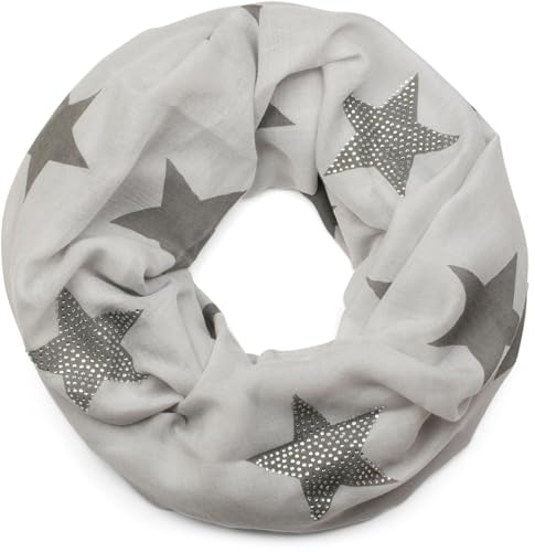 styleBREAKER Loop Schal mit Sterne Muster und edler Strass Applikation, Schlauchschal, Tuch, Damen 01018086, Farbe:Hellgrau-Grau (One Size)