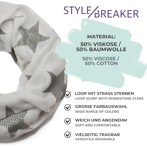 Der styleBREAKER Loop Schal mit Sterne Muster und glitzernder Strass Applikation ist ein modisches Must-Have. Trage ihn vielseitig um den Hals und genieße den Komfort des weichen Materials in trendigem Hellgrau.