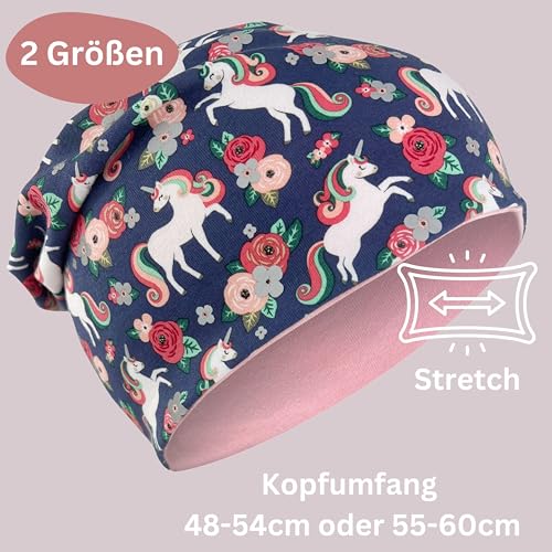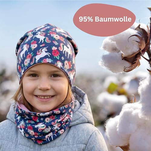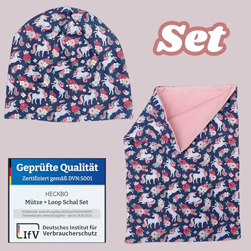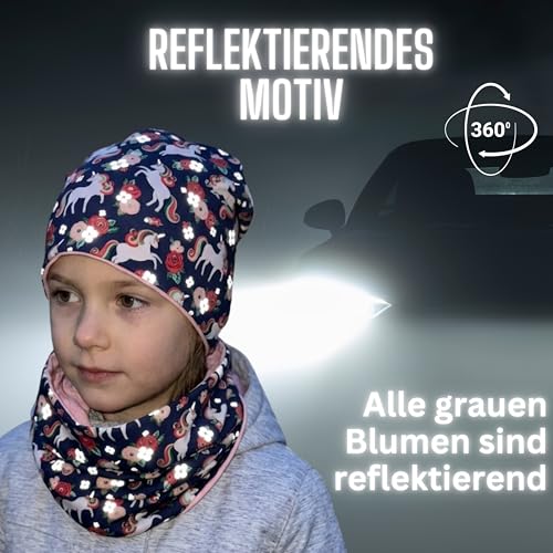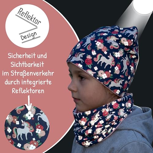 HECKBO 360° Reflektor Kinder Mütze & Loop Schal Set – Einhorn – Reflektoren an Felgen Reifen- 2-8 Jahre – 95% Baumwolle – weiches & pflegeleichtes Stretch-Material – Jungen Jungs Beanie