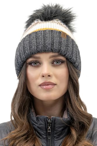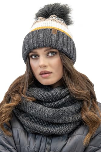VIVISENCE Modisches Winterset Für Damen Warme Mütze Mit Antistatischem Fleece Und Umweltfreundlichem Bommel Passender Loop-Schal Aus Weichem Garn Perfekt Für Kalte Tage Und, Dunkelgrau,Einheitsgröße