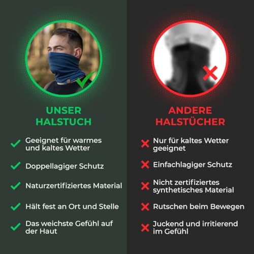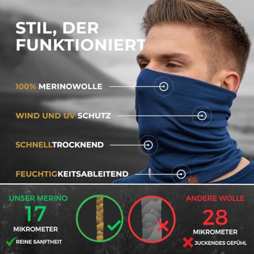 | Features | ✅ PREMIUM MERINOWOLLE: Hergestellt aus doppellagiger 100% Merinowolle, bietet dieser Merino Schlauchschal außergewöhnliche Atmungsaktivität, Geruchsbeständigkeit und Thermoregulation. Er hält Sie bei kaltem Wetter warm und sorgt dafür, dass Sie kühl bleiben, wenn die Temperaturen steigen, was ihn zu Ihrem unverzichtbaren Accessoire für alle Outdoor-Abenteuer macht., ✅ VIELSEITIGES DESIGN: Dieses Multifunktionstuch kann auf verschiedene Weise getragen werden – als Halswärmer, Ski-Maske oder sogar als Stirnband. Es bietet vollständigen Schutz für Ihren Nacken, Ihre Ohren und Ihr Gesicht und ist somit perfekt für Outdoor-Aktivitäten wie Laufen, Wandern, Skifahren oder Motorradfahren., ✅ EINHEITSGRÖSSE MIT ENGEM SITZ: Das hochdehnbare Material sorgt für eine enge Passform, die sich allen Kopfgrößen anpasst. Dieser unisex Halswärmer ist sowohl für Damen als auch für Herren geeignet und bietet einen sicheren, festen Sitz, egal ob als Halsschlauch oder Gesichtsmaske getragen., ✅ FEUCHTIGKEITSABLEITEND UND SCHMUTZABWEISEND: Das Merinowolle-Gewebe leitet Feuchtigkeit effizient ab und hält Sie trocken. Seine antistatischen und schmutzabweisenden Eigenschaften sorgen dafür, dass der Schlauchschal länger sauber bleibt, selbst bei intensiven Outdoor-Aktivitäten wie Skifahren, Radfahren oder Arbeiten im Freien., ✅ WEICH UND HYPOALLERGEN: Mit Flatlock-Nähten designed, verhindert dieser Halswärmer jegliche Hautirritationen oder Juckreiz. Das Öko-Tex-zertifizierte Material ist frei von schädlichen Chemikalien, wodurch es sicher und angenehm für empfindliche Haut ist. |