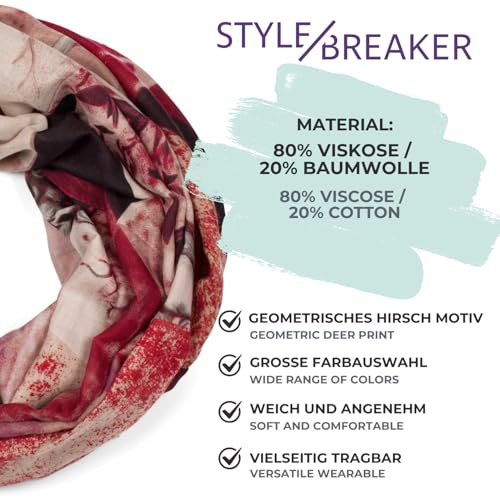 Der styleBREAKER Damen Loop Schal mit Hirsch Print verbindet eleganten Stil und Komfort. In verschiedenen Farbkombinationen erhältlich, lässt er sich vielseitig tragen und bietet angenehme Wärme. Perfekt, um deinem Look einen besonderen Akzent zu verleihen!