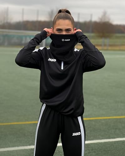 Der JAKO Neckwarmer ist in schlichtem Schwarz gehalten, was ihn leicht kombinierbar mit verschiedenen Outfits macht. Das schlichte Design sorgt dafür, dass er sowohl sportlich als auch casual getragen werden kann.