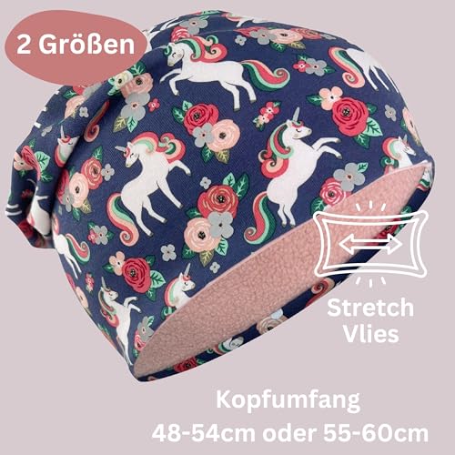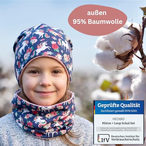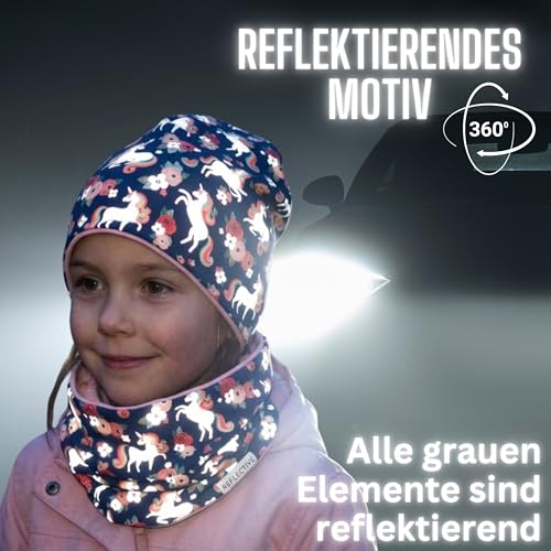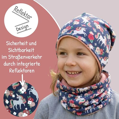 HECKBO Winter 360° Reflektor Kinder Mütze & Loop Schal Set – Einhorn Vlies innen – 2-6 Jahre – 95% Baumwolle – weiches & pflegeleichtes Stretch-Material