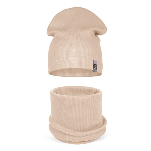 HEYO Kinder Beanie Mütze Schlauchschal Set für Mädchen Jungen Frühling Strickmütze Schal (Beige)